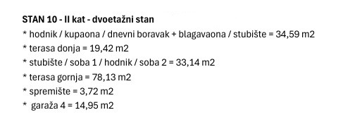 Pag – Povljana, prodaje se dvoetažni dvosobni apartman od 67,73 m2 na drugom katu stambenog objekta sa ukupno deset apartmana, izgrađenog 2025 godine. Sastoji se od dvije etaže: – donja: dnevni boravak + kuhinja + blagovaona, hodnik, kupaonica i terasa. – gornja: dvije spavaće sobe, hodnik i terasa. IZ APARTMANA SE PRUŽA POGLED NA MORE!!! Nalazi se na dobroj lokaciji 310 m udaljen od mora i plaže, 500 m od plaže Mali Dubrovnik, blizina trgovine, kafića, restorana te svih ostalih sadržaja potrebnih za ugodan i miran odmor!! Posjeduje garažu od 14,95 m2 i spremište od 2,34 m2. Apartman ima električno podno grijanje u svim prostorijama i klimatizaciju. Zgrada ima lift. Dokumentacija uredna. Tlocrt gledati apartman S10. Mogućnost kupnje garaže i dodatnog parkirnog mjesta. Planirano useljenje 01/2026.