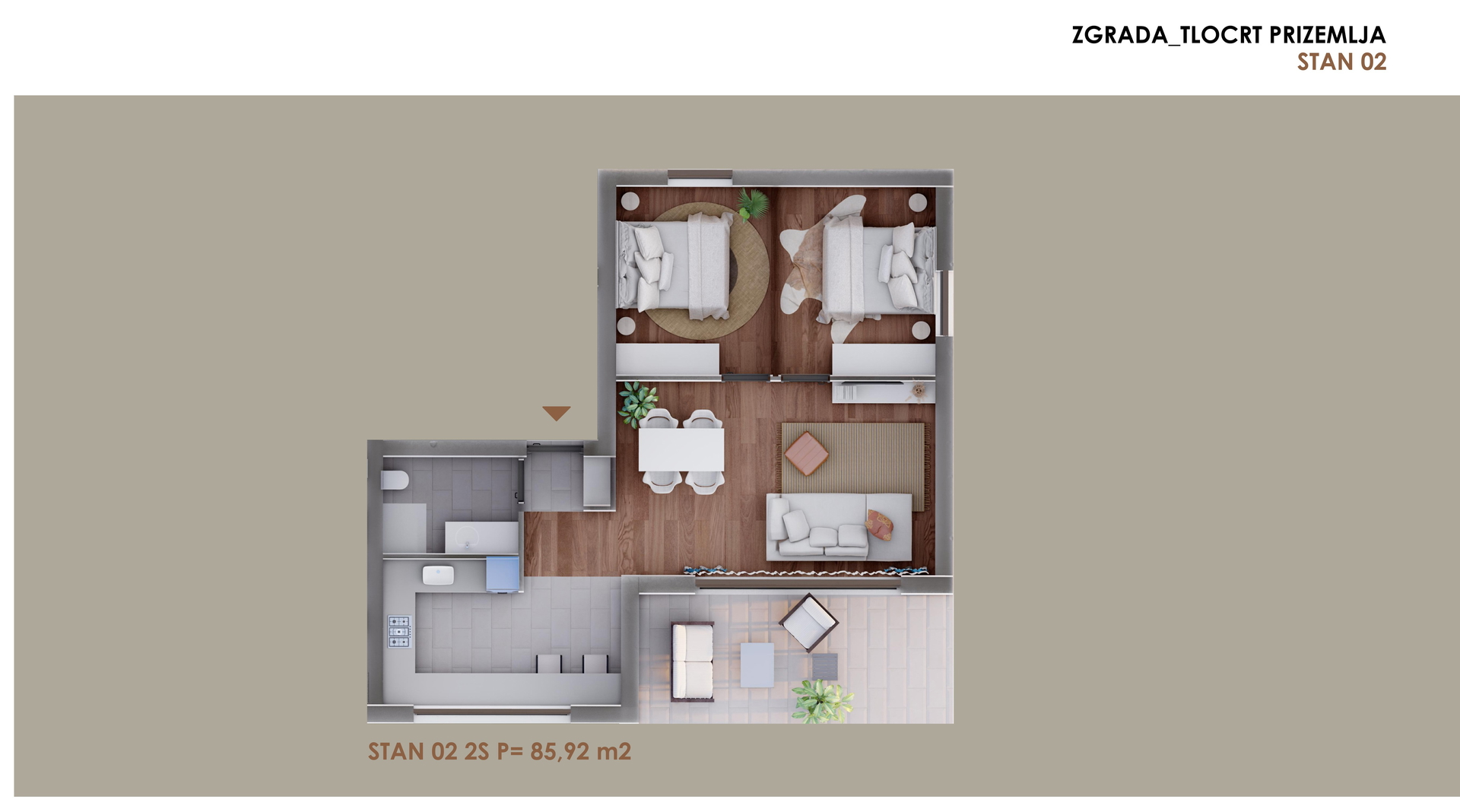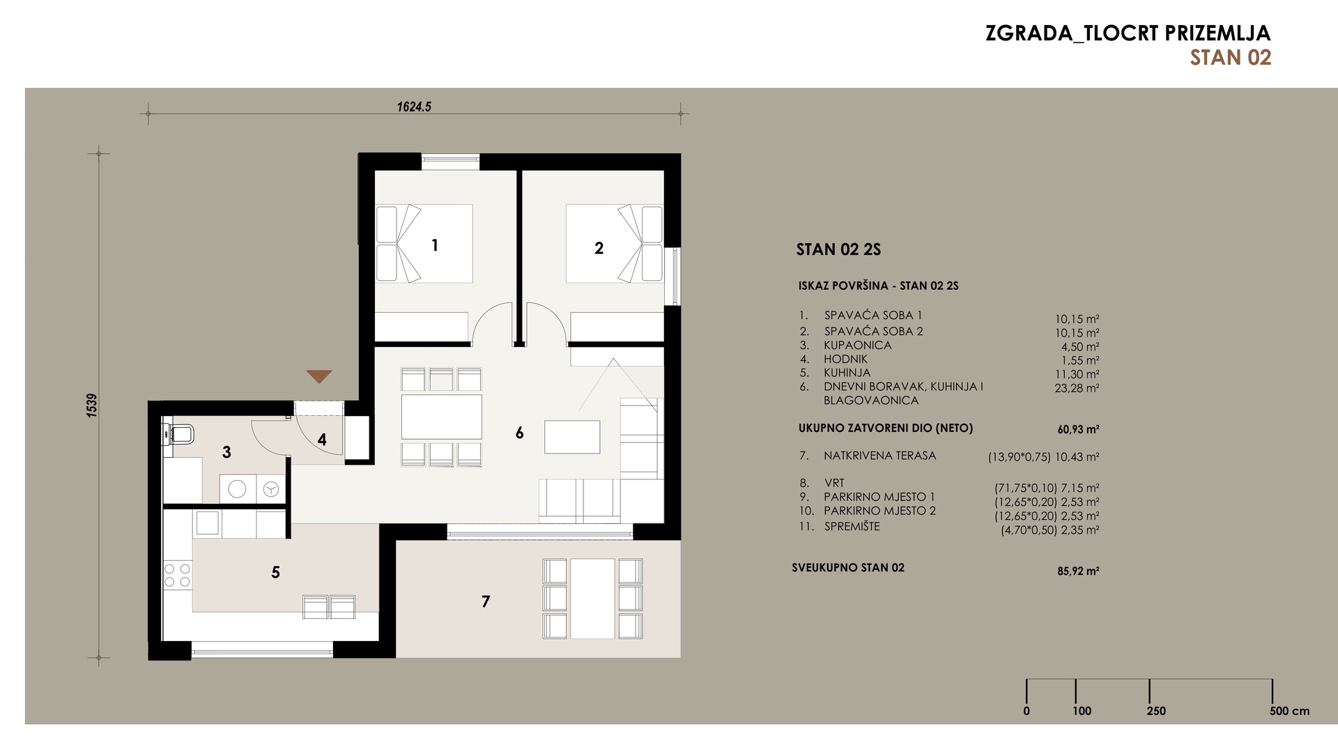 Zadar – Borik, prodaje se dvosobni stan od 85,92 m2 u prizemlju stambenog objekta u izgradnji sa ukupno šest stanova, kavlitetna gradnja. Planirano useljenje 12/2025. Sastoji se od: dvije spavaće sobe, dnevnog boravka + kuhinja + blagovaona, hodnika, kupaonice i natkrivene terase. Nalazi se na odličnoj lokaciji 520 m udaljen od mora i plaže, blizina trgovine, škole, autobusne stanice, ljekarne, crkve te svih ostalih sadržaja potrebnih za ugodan život i odmor!! Posjeduje dva parkirna mjesta, vrt od 71,75 m2 i spremište od 4,70 m2. Dokumentacija uredna. Gledati dokumentaciju stan S2.