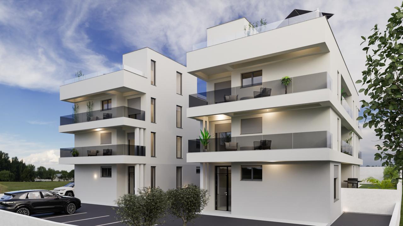 Zadar – Petrčane (Punta Radman), prodaje se dvosobni apartman od 105,90 m2 na drugom katu stambenog objekta u izgradnji, kvalitetna gradnja, podno grijanje u cijelom apartmanu. Planirano useljenje 06.2027. godine. Sastoji se od: dvije spavaće sobe, dnevnog boravka + kuhinja + blagovaona, hodnika, kupaonice, wc-a i terase. IZ APARTMANA SE PRUŽA POGLED NA MORE!!! Nalazi se na odličnoj lokaciji 240 m udaljen od mora i plaže, blizina svih potrebnih sadržaja za ugodan i miran odmor!! Posjeduje dva parkirna mjesta (jedno natkriveno) priprema za auto punjač, krovnu terasu od 69,78 m2 (tuš na krovnoj terasi i priprema za kuhinju) i spremište od 3,73 m2. Dokumentacija uredna.
