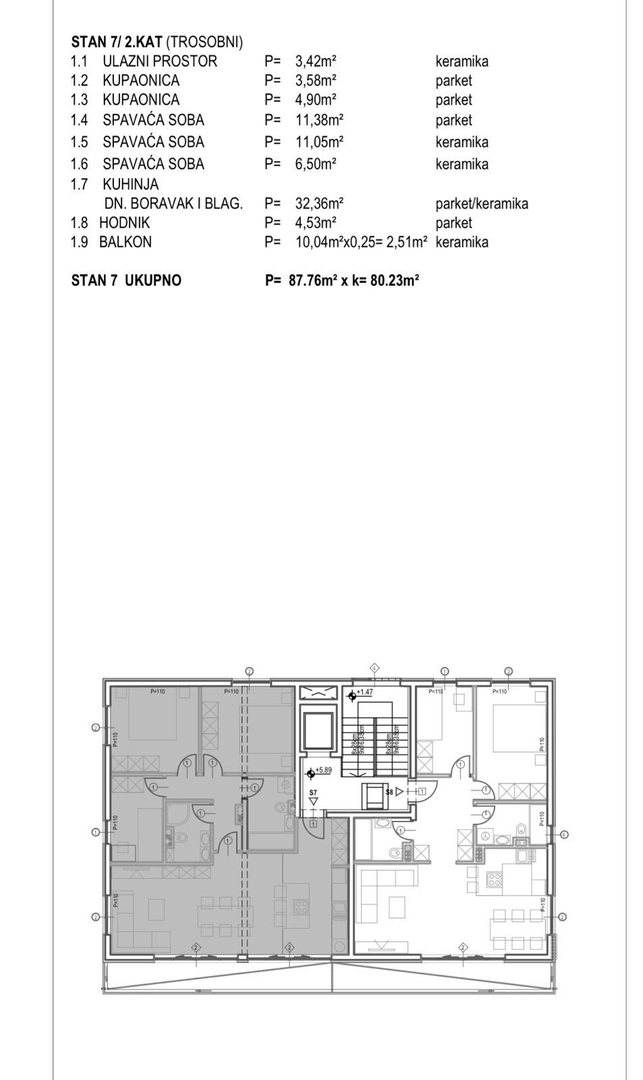 Zadar – Plovanija, prodaje se trosobni stan od 80,23 m2 na drugom katu stambenog objekta u izgradnji sa ukupno osam stanova, planirano useljenje 01.04.2026. Sastoji se od: tri spavaće sobe, dnevnog boravka + kuhinja + blagovaona, hodnika, dvije kupaonice i balkona. IZ STANA SE PRUŽA POGLED NA MORE!!!! Nalazi se na dobroj lokaciji, blizina svih potrebnih sadržaja potrebnih za ugodan život!!! Posjeduje garažno parkirno mjesto, vanjsko parkirno mjesto i spremište. Zgrada ima lift. Mogućnost kupnje stana potpuno namještenog, kupac trenutno može birati parkete, pločice, sanitarije i namještaj. Dokumentacija uredna.