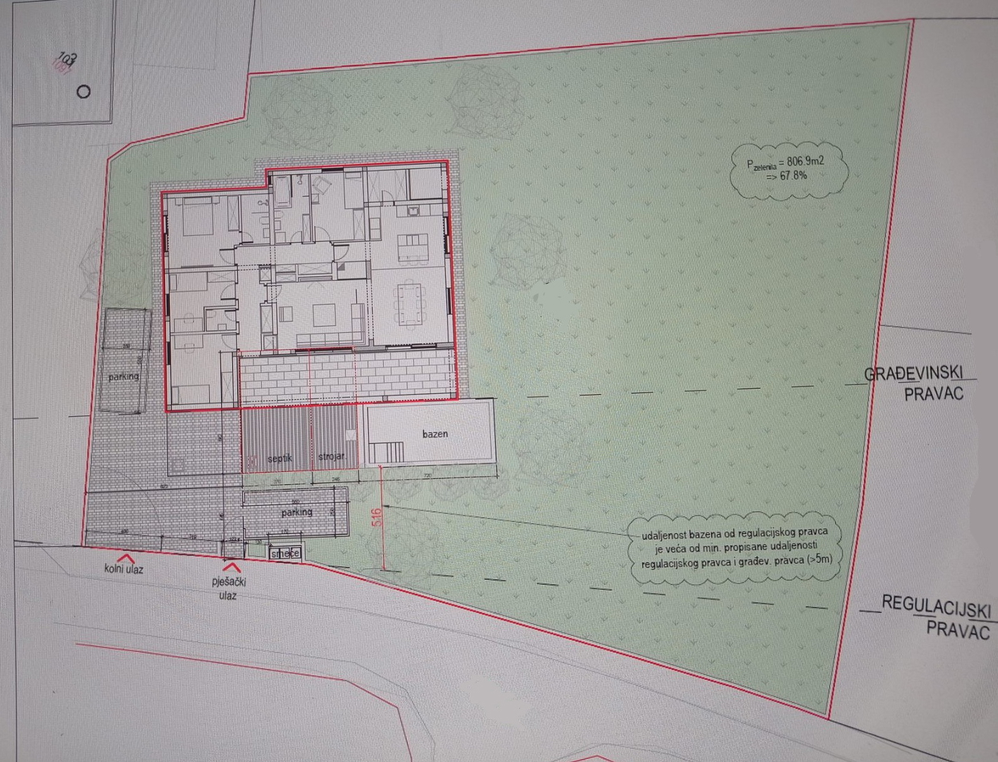 Zadar – Poličnik, prodaje se građevinsko zemljište od 1189 m2. Zemljište je pravilnog oblika dimenzija cca. 38m dužina uz cestu x 36m širina x 22m širina sa druge strane, prilazna asfltna cesta, sturja i voda pored. Zemljište posjeduje projekte za obiteljsku kuću od cca.150 m2 + bazen i gusterna te je predan zahtijev za građevinsku dozvolu koja se očekuje ubrzo. Nalazi se na dobroj lokaciji, udaljen od grada Zadra cca.14km, od mora i plaže cca.10km, blizina ljekarne, nogometnog igrališta, trgovine, vrtića te svih ostalih sadržaja potrebnih za ugodan i miran život te odmor!!! Mogućnost parcelacije te izgradnje i drugog objekta. Dokumentacija uredna.
