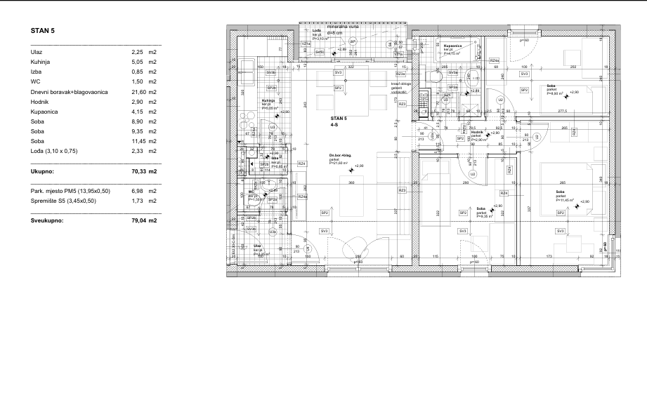 Zagreb – Donja Dubrava (Retkovec), prodaje se dvosobni stan od 79.04 m2 na prvom katu stambene zgrade u izgradnji, planirano useljenje krajen 2026. godine. Stan se sastoji od: tri spavaće sobe, kuhinje + blagovaone i dnevnog boravka, ostave, kupaone wc-a, i loggie. Posjeduje vanjsko parkirno mjesto i ostavu. Specifikacija površina: – Ulaz 2,25 m2 – Kuhinja 5,05 m2 – Ostava 0,85 m2 – WC 1,50 m2 – Dnevni boravak + blagovaonica 21,60 m2 – Hodnik 2,90 m2 – Kupaonica 4,15 m2 – Soba 8,90 m2 – Soba 9,35 m2 – Soba 11,45 m2 – Lođa 2,33 m2 Parkirno mjesto PM5 6,98 m2 Spremište S5 1,73 m2 Stambena površina 70,33 m2 Sveukupno 79,04 m2 Lokacija je u zoni Čulinečke i Dubrave u blizini Doma zdravlja vrtića osnovnih škola trgovina poput Lidla i Konzuma pekarne i ljekarne te je dobro povezana vlakom tramvajem i autobusom a nalazi se u mirnoj mikrolokaciji s dobrom prometnom povezanošću. Dokumentacija uredna