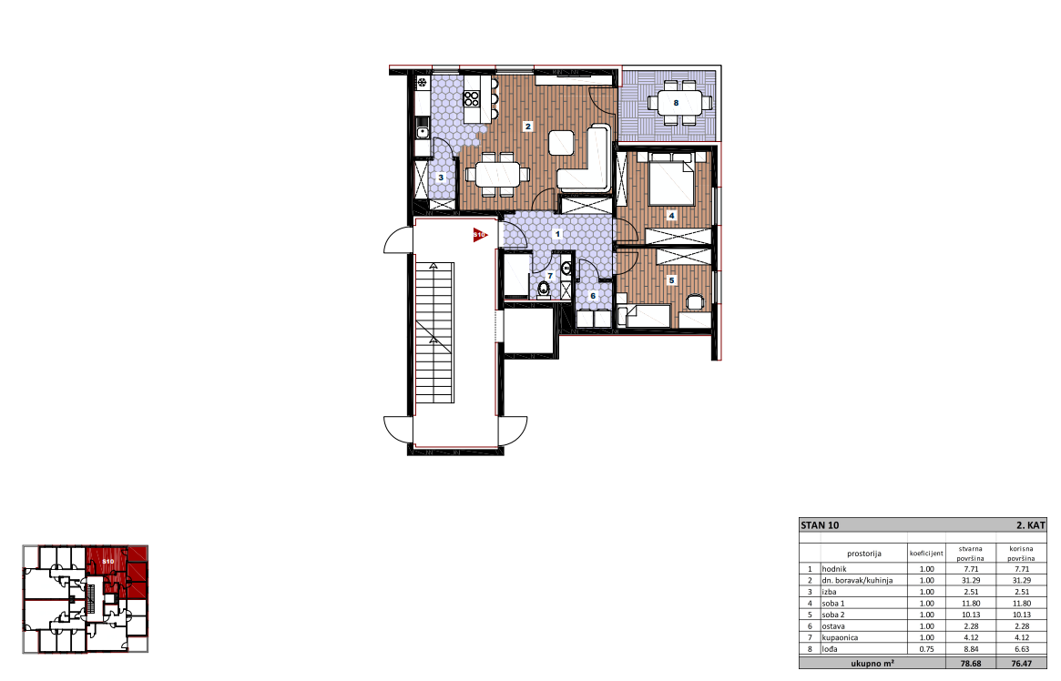 Zagreb – Sesvete (Gajišće), prodaje se stan od 76,47 m2 na drugom katu stambene zgrade u izgradnji, planirani rok useljenja je kraj 2026. godine. Sastoji se od: dvije spavaće sobe, kuhinje s blagovaonom i dnevnim boravkom, kupaone, ostave, i lođe. Zgrada ima lift. U cijenu i kvadraturu nisu uračunati garažno mjesto i spremište u podrumu zgrade; postoji mogućnost odabira istih. Nalazi se na izvrsnoj lokaciji 700m od centra grada Sesveta, u mirnom okruženju, tik uz šumu. Planski je osmišljeno stoga je sve potrebno nadohvat ruke, što se naročito odnosi na osnovnu i srednju školu, trgovačke centre (Kaufland, Konzum…), Hrvatsku poštu, Dom zdravlja, banke, ljekarne… Dokumentacija uredna. Stan je oznake S10.