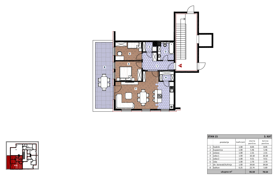 Zagreb – Sesvete (Gajišće), prodaje se stan od 78,54 m2 na trećem katu stambene zgrade u izgradnji, planirani rok useljenja je kraj 2026. godine. Sastoji se od: dvije spavaće sobe, kuhinje s blagovaonom i dnevnim boravkom, kupaone,ostave i lođe. Zgrada ima lift. U cijenu i kvadraturu nisu uračunati garažno mjesto i spremište u podrumu zgrade; postoji mogućnost odabira istih. Nalazi se na izvrsnoj lokaciji 700m od centra grada Sesveta, u mirnom okruženju, tik uz šumu. Planski je osmišljeno stoga je sve potrebno nadohvat ruke, što se naročito odnosi na osnovnu i srednju školu, trgovačke centre (Kaufland, Konzum…), Hrvatsku poštu, Dom zdravlja, banke, ljekarne… Dokumentacija uredna. Stan je oznake S15.
